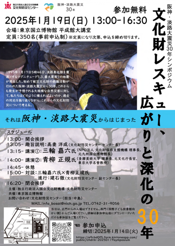 文化財防災センターより、阪神・淡路大震災30年シンポジウム「文化財レスキュー、広がりと深化の30年」開催のお知らせです。当機構の三輪嘉六理事長も登壇いたします。
